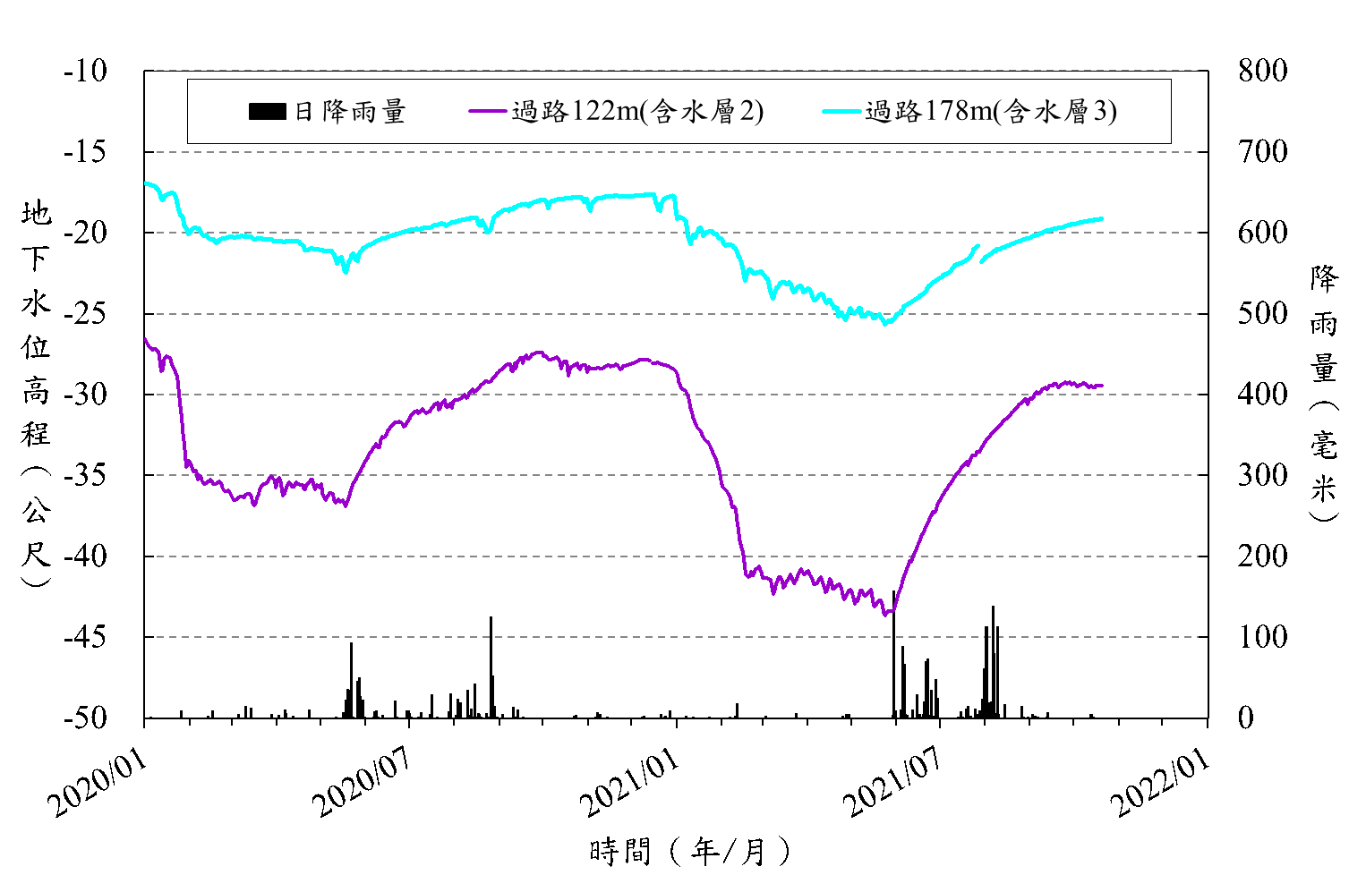 過路國小_地下水與雨量及下陷分析圖.png
