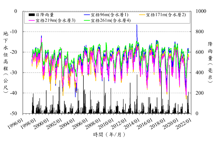 宜梧國中_地下水與雨量及下陷分析圖.png